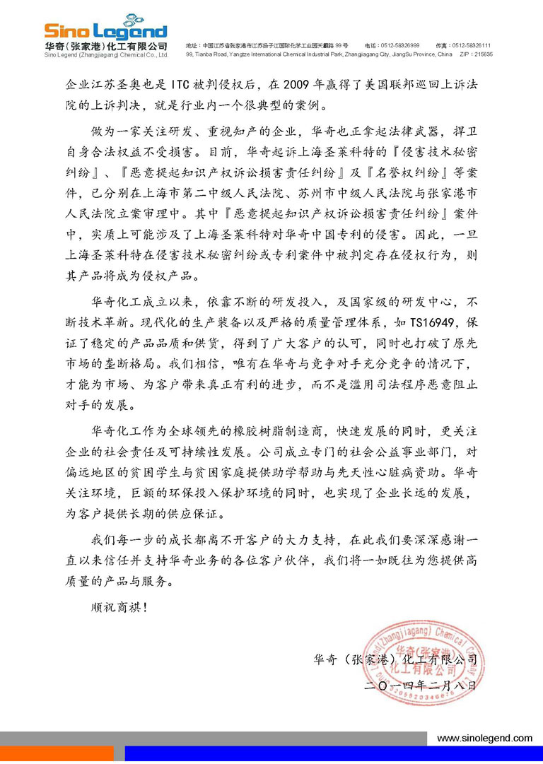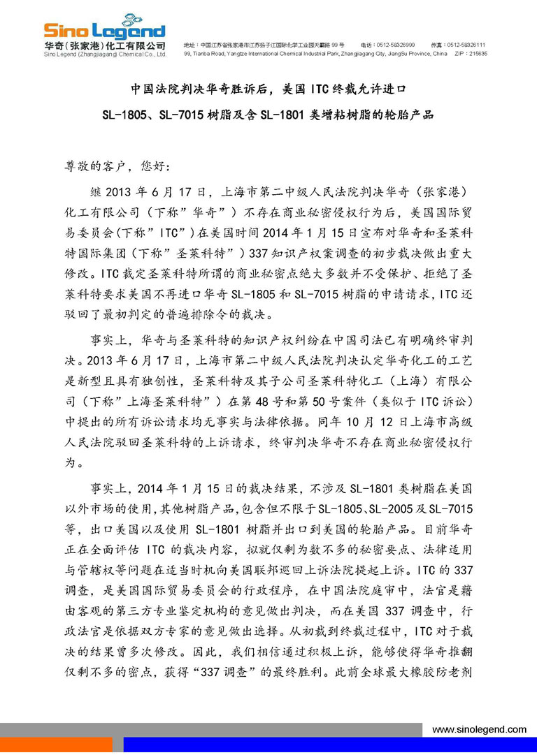 中国法院判决华奇胜诉后,美国ITC终裁允许进口SL-1805、SL-7015树脂及含SL-1801类增粘树脂的轮胎产品